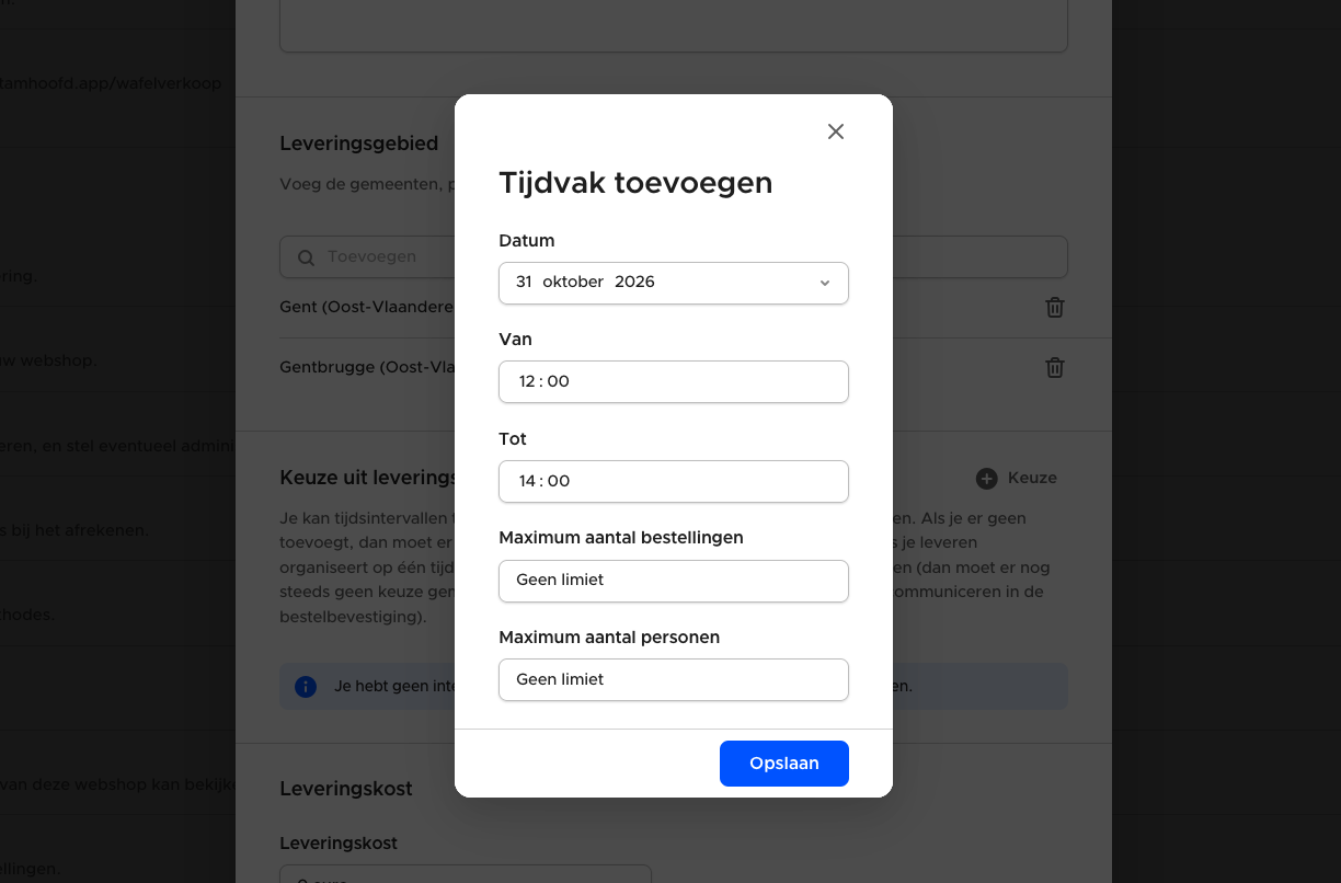 Vervolgens kan je optioneel alle tijdstippen toevoegen waarin je ongeveer zal leveren. Als je meer dan één tijdstip toevoegt, krijgt de besteller de keuze uit alle tijdstippen. Als je geen tijdstip toevoegd, is er geen keuze en is de leveringstermijn 'onbepaald' (bv. via Bpost).
