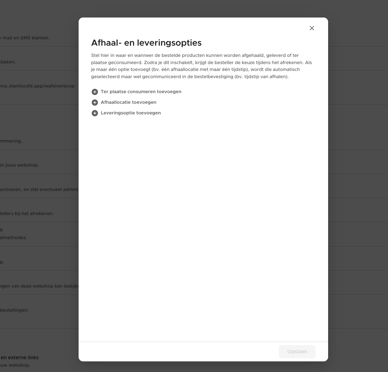 Om dit in te stellen, ga je naar de instellingen van je webshop, en kies je voor 'Afhalen, leveren, ter plaatse eten'.