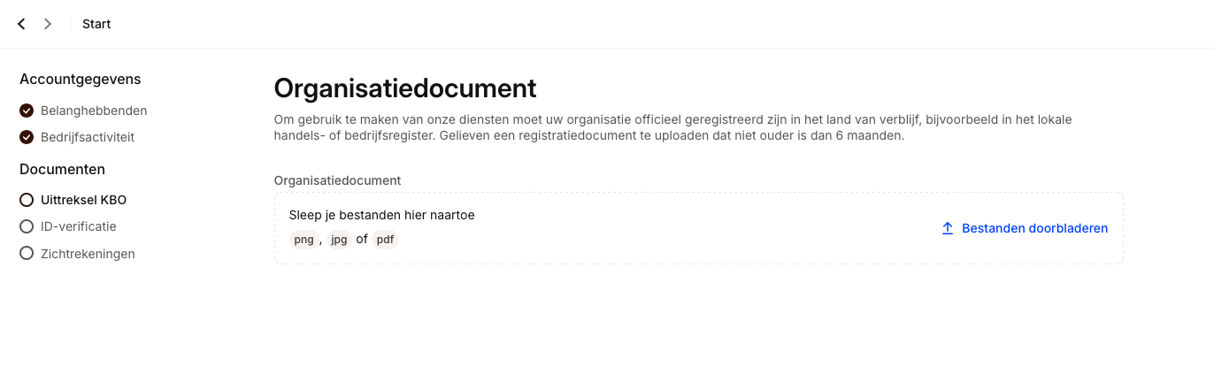 - Als een organisatiedocument gevraagd wordt, dan had je 'feitelijke vereniging' gekozen als rechtsvorm. Vul dan het document in dat je hierboven in de documentatie kan downloaden, scan het in en upload het hier.