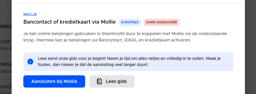 Naast Stripe kan je ook Mollie gebruiken op Stamhoofd. Het voordeel is dat Mollie Europees is, de ondersteuning daardoor beter is, en dat de kosten gemiddeld genomen dezelfde zijn of soms lager als je gemiddelde transactie hoger is dan 45 euro.