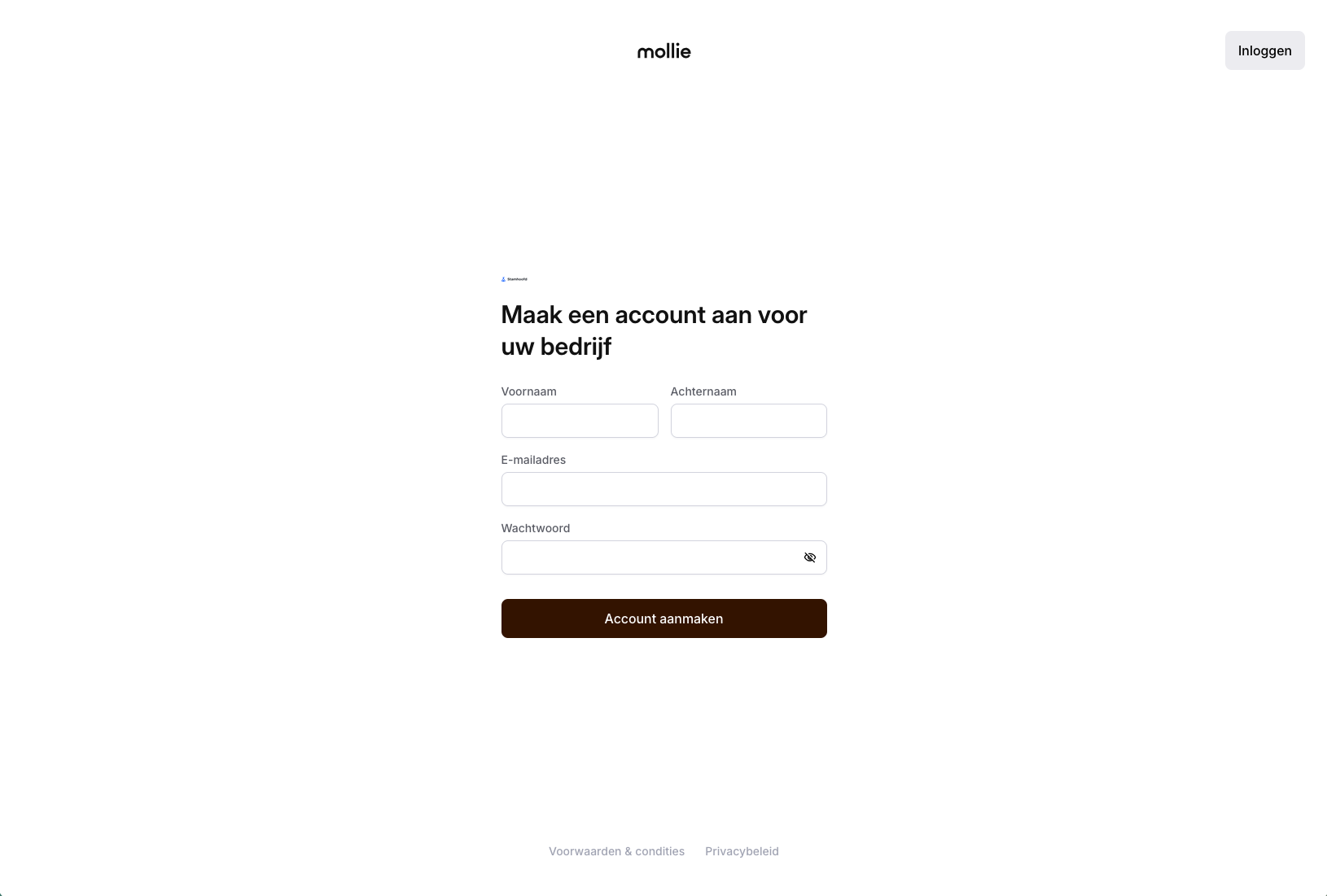 Na het klikken op 'Aansluiten bij Mollie', klik je rechtsbovenaan op 'Aanmelden' om een nieuw bedrijf aan te maken in Mollie in plaats van een bestaand Mollie account te koppelen.