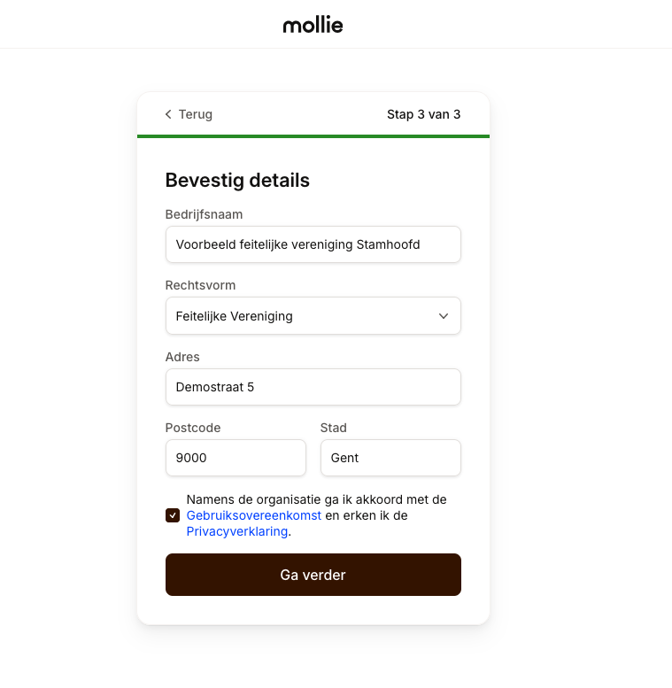 Op het Mollie dashboard krijg je een checklist van alle todo's die je nog moet aanvullen. Klik onderaan op 'Ga verder' om alles netjes aan te vullen.